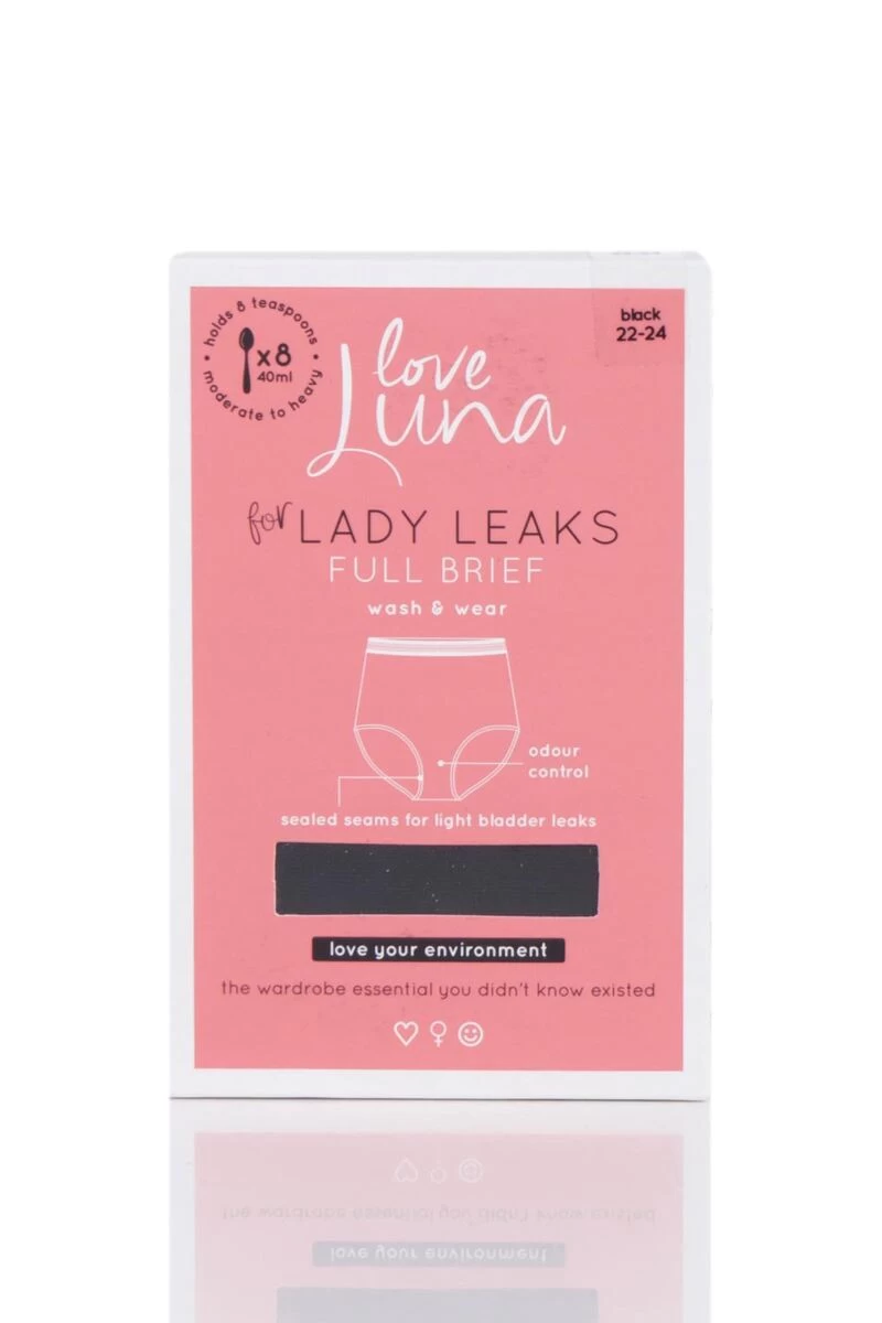 Everyday protection from little leaks caused by simple everyday problems like coughing, laughing, sneezing, jumping or lifting, Love Luna Lady Leaks Full Briefs keep you confidently carrying on with you day. Incorporating a patented sealed seam and a full five layers of absorbent protection, these briefs are made from soft, breathable cotton, decorated by a cute lace trim.