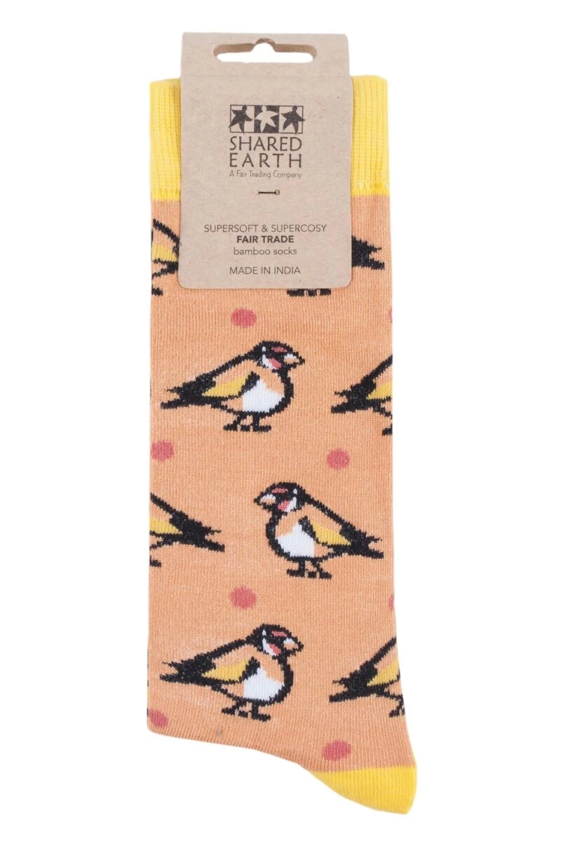 Brighten up your day with these soft orange sorbet Shared Earth Fair Trade Bamboo Goldfinches Socks. Decorated by a delightful repeat bird motif, a scattering of deep pink polka dots, and contrasting yellow cuff, toe and heel, these socks are full of the character of these sociable, cheerful finches.