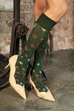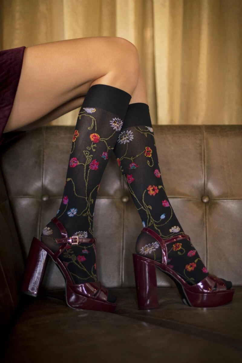 Ornate, colourful luxury level knee highs from Italy, Trasparenze Platino Floral Knit Opaque Knee High Socks are 80 denier opaque mattes with a lavish, winding stem and flower design that moves around and up the feet and lower legs, spreading the multi-colour pattern as it goes.