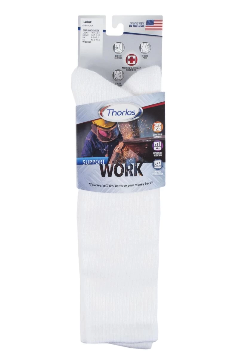 Long days of standing or walking take their toll on tired legs and feet, so protect yourself with a pair of Thorlos Support Work Wear Socks, made for maximum protection while wearing work footwear. Extra spandex provides light compression in the calf and reduces fatigue from constant standing, while targeted padding in the ball, heel and extended heel is placed at weight-bearing areas for demanding work, clinically shown to reduce blister, pain, pressures and moisture.