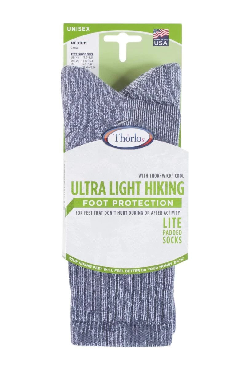 Using ‘Thor-Wick Cool’ fabric and light zonal cushioning at the heel and ball of the foot, Thorlos Ultra Light Hiker Crew Socks are ideal for light day hikes, or for casual street use. These mid-calf length ‘made in the USA’ socks use low-profile toe seams, designed to not irritate toes during wear. A longer over-the-calf version is also available.