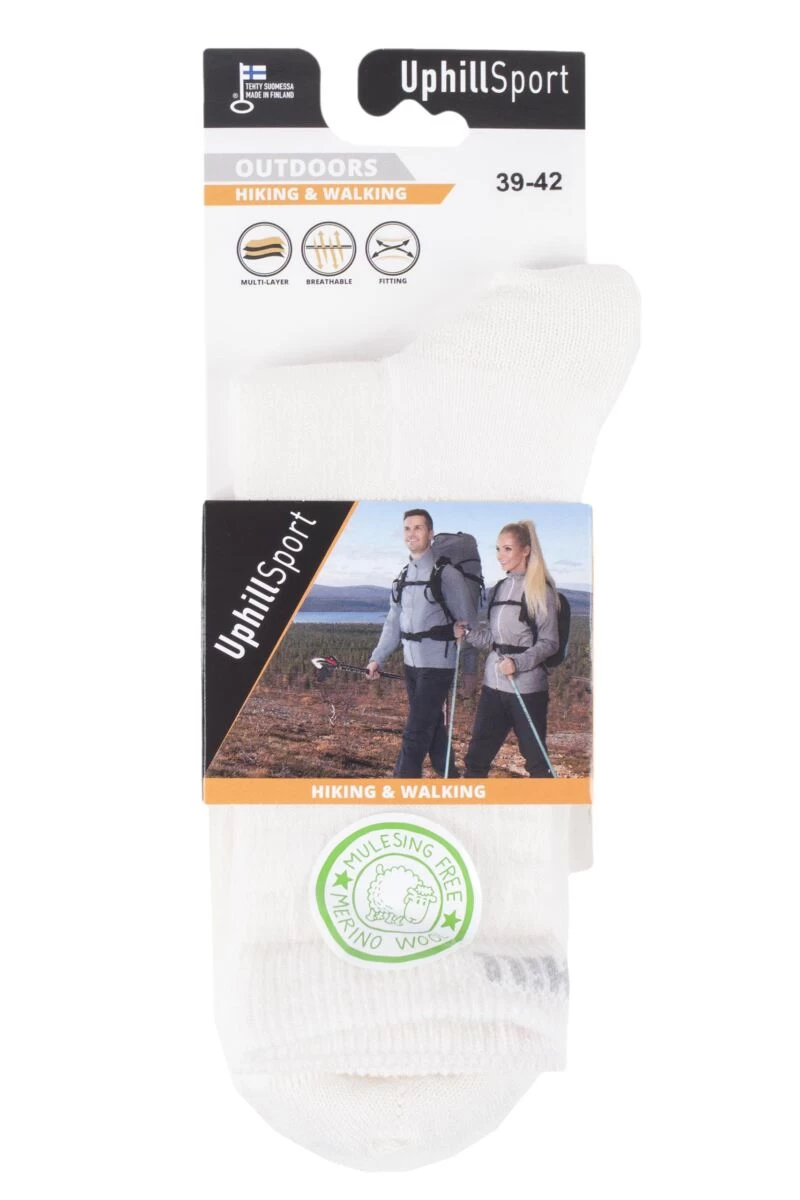 The triple layer design makes the most of Merino’s warmth and moisture absorbing abilities, sandwiched between durable, breathable synthetics to keep feet dry and insulated. A whole-body elastic structure provides the perfect fit and teamed with a Nylon-reinforced sole, fitted heel and seamless toe design, prevents friction from sock movement causing blisters to form. Uphill Sport use only merino wool for their socks, derived from mulesing-free flocks to prevent cruelty.