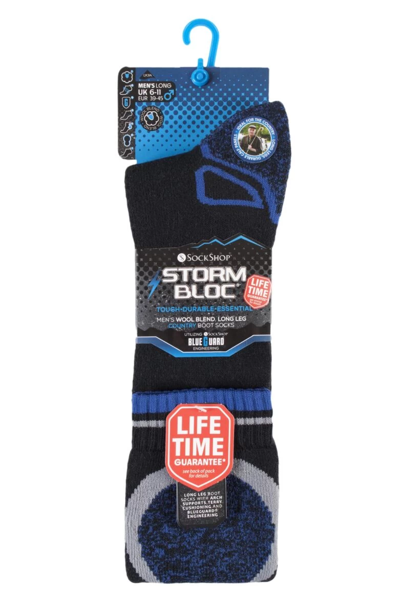 Storm Bloc with BlueGuard Long Wool Blend Country Socks are very serviceable all-round country socks, ideal for longer riding boots and Wellington boots. Each pair is terry cushioned to increase comfort while cutting down rubbing, impact shock and foot fatigue. They have extended heels, woven-in arch supports, durable calf panels and reinforced toe seams. Storm Bloc with BlueGuard Long Wool Blend Country Socks have a lifetime guarantee in the unlikely event that a hole is worn in them.