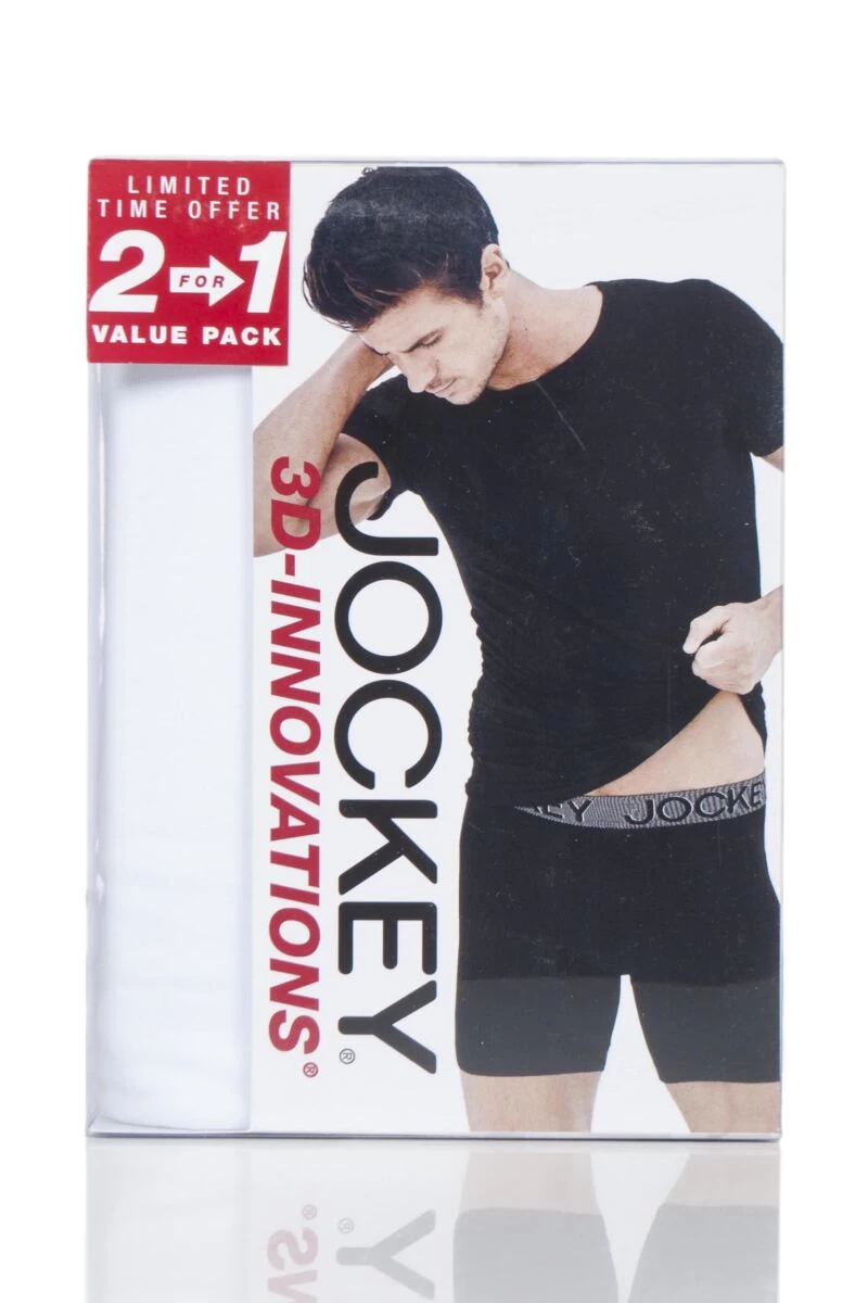Amazing fit, amazing feel, amazing value! These 2 for the price of 1 Mens Jockey 3D Innovation T-Shirts are the classic plain, round neck shirts that everyone needs, but made better, with a contoured shape, unbelievable all-ways stretch, flat seams and a tag-free heat seal label, making them fit and feel like a second skin.