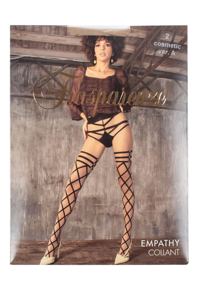 Strappy-looking and striking with a 30 denier sheer leg, patterned with faux crossover straps and ‘studded’ hold up tops, Trasparenze Empathy Mock Hold Up Tights are dynamic, attention-grabbing hosiery designers to make your legs the centre of any fashion situation. The cross-crossing, bondage-strapped pattern continues into the body section, with a wraparound ‘belt’, a skimpy mock panty and deep opaque comfort waistband.