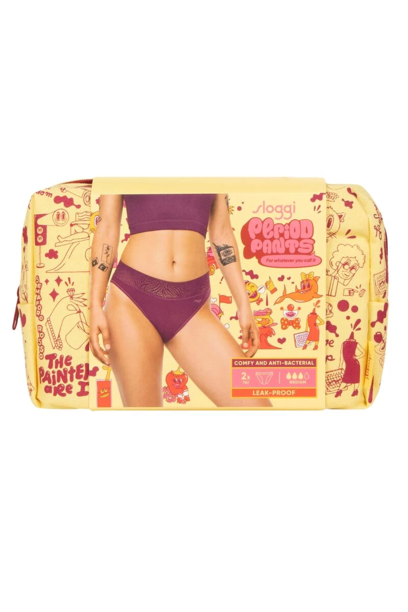 For those days during your period when you’ve got a medium/moderate flow (you’d typically use up to three tampons) these Sloggi Tai Medium Period Pants have you covered. The innovative design incorporates an extra-long gusset that is ultra-thin with four-layers of absorbent, moisture-locking and leakproof protection, and with an Silvadur 930 antimicrobial technology treatment. Sloggi Period Pants come as a twin pack, with a useful, witty zip-up toiletry bag decorated by irreverent period humour.