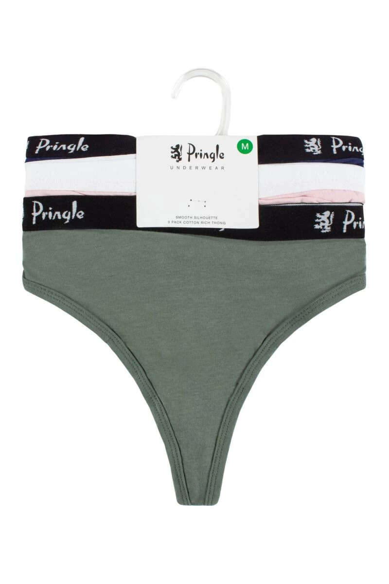 Minimal cover, maximal results — when you don’t want a VPL, a thong is the way to go! This mixed shade triple pack of Pringle Smooth Silhouette Cotton Rich Thongs are stylish, quality stretch jersey ladies’ underwear with comfortable, contrast coloured Pringle-branded elasticated waistbands which sit higher on the waist and lower on the leg to help create a flattering silhouette.