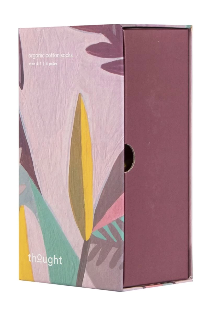 In a mix of four lively, colourful floral patterns, this set of Thought Blossom Organic Cotton Gift Boxed Socks are sure to make an eye-catching display on the ankles. For fans of floral patterning, these four designs are more abstract and creatively rendered than the usual, smaller ‘ditsy’ flower look. These ladies’ casual crew length socks are soft, breathable and have smooth toe seams for added comfort.