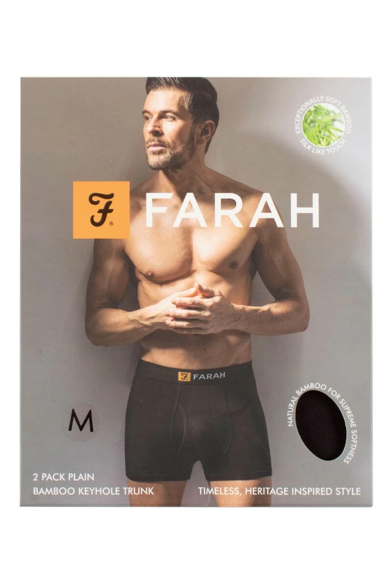 - Skin-kind bamboo fibre; Inherent antibacterial and hypoallergenic properties; Tagless care label for zero irritation; Farah branded waist; 4cm long inseam; Machine washable at 40°