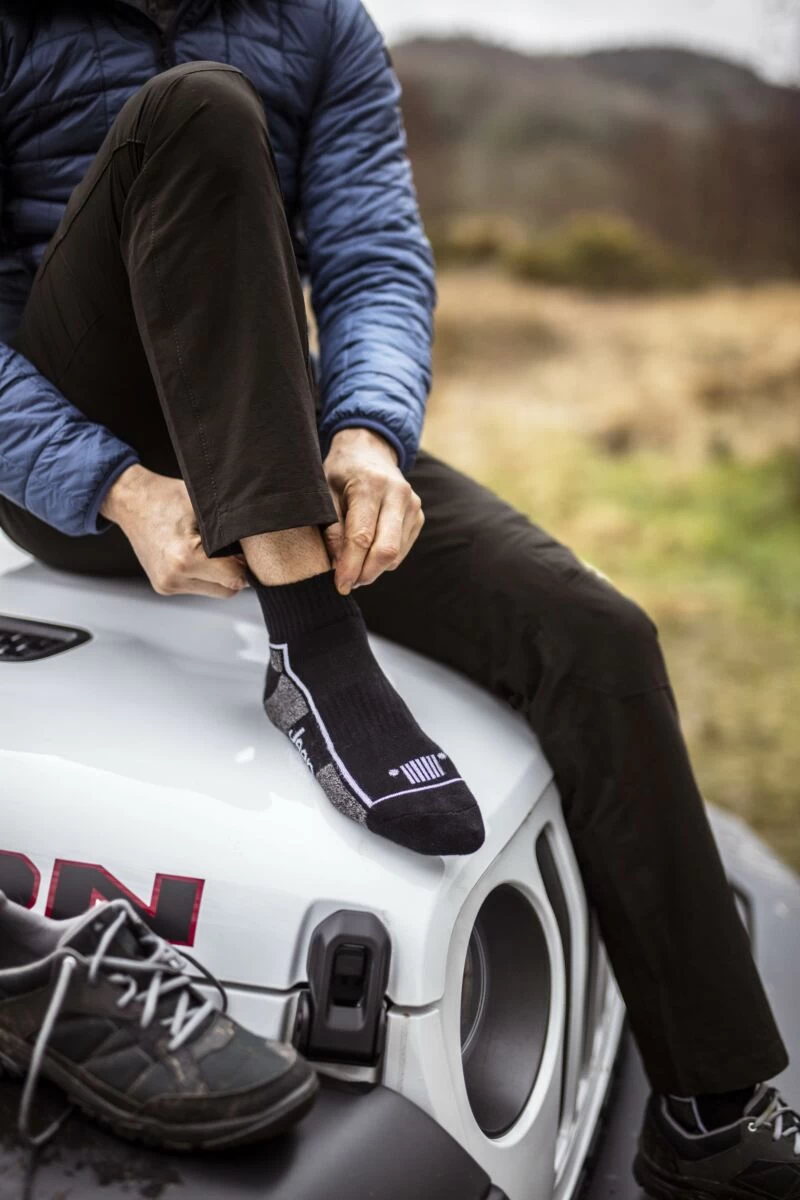 The knit blends cotton and polyester with elastane for a comfortable, soft and breathable fit and feel. The half foot terry loop cushioning protects the typical impact areas of the sole, toes and heels, absorbing shocks and providing extra moisture absorbency too. Extra protection is added with an extended Achilles heel tab. The non-cushioned uppers of these Jeep men’s socks have breathable mesh panels inserted, designed to vent warm and damp air and keep the feet cool and dry. An elasticated arch band wraps the mid foot for arch support and to ensure the socks remain in place during the day.