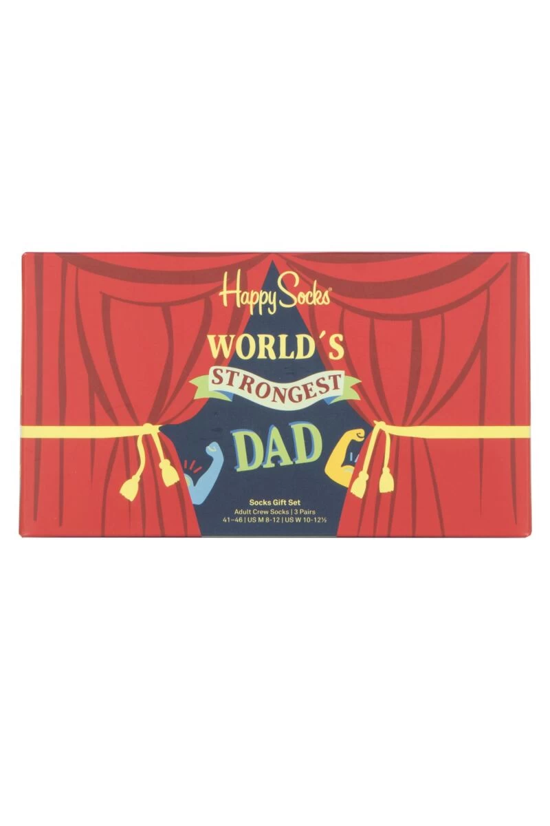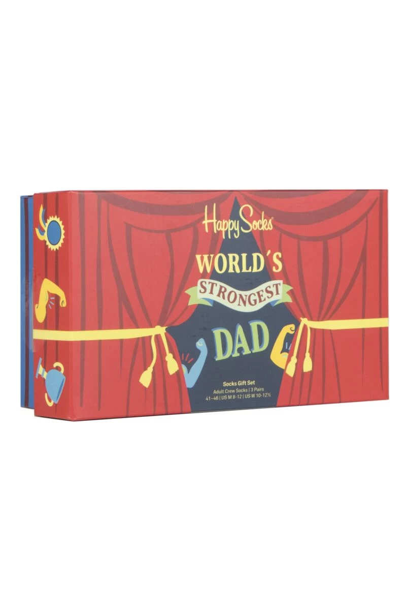 Styles included in the Happy Socks Fathersā Day box set are novelty patterns showing arms with flexed biceps, a big polka dot with rosettes and winnerās cups and a pair proudly proclaiming āWorldās Strongest Dadā!