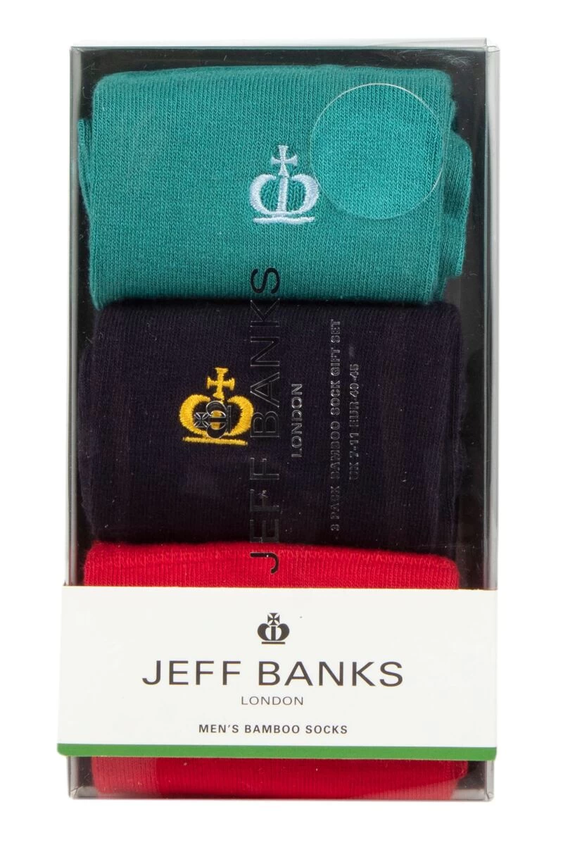 A three pair selection of the softest-feeling men’s plain socks, woven in a skin-friendly bamboo rich fibre blend, these Jeff Banks Gift Boxed Bamboo Socks are a gift of comfort that any man will be glad of. Each pair of these colourful crew length socks is knitted in a fine gauge that is breathable and comfortable against the skin. It’s distinctively silky, gentle and touchable thanks to bamboo’s extra-smooth fibres. They’re decorated by a contrast colour Jeff Banks crown insignia embroidered on the legs.
