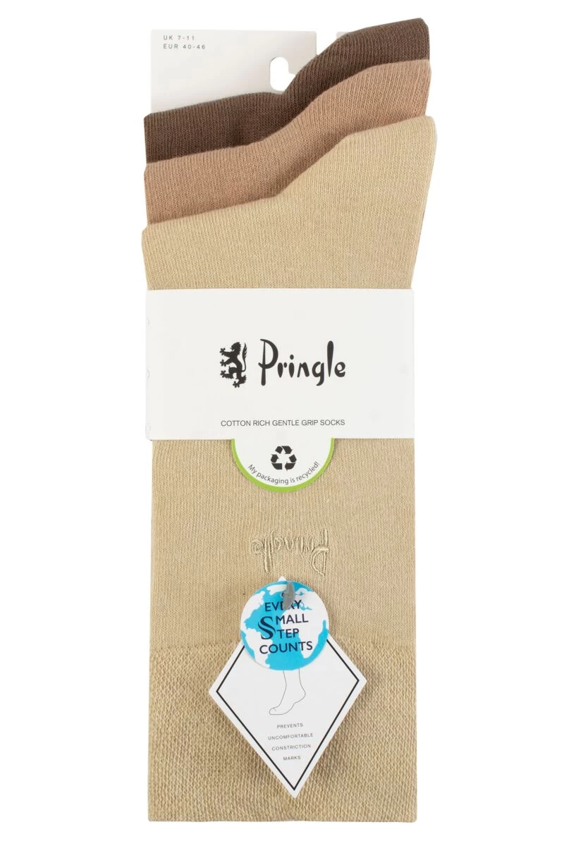 In a versatile triple pack of practical mixed shade plain colours, these men’s Pringle Dunvegan Gentle Grip Cotton and Recycled Polyester Socks are made to be that bit more comfortable for legs and feet. In a smooth, fine gauge knit, these three pairs of breathable, soft and cotton rich socks have honeycomb weave gentle grip cuffs, helping them hold to your legs all day long without tightness or pressure.