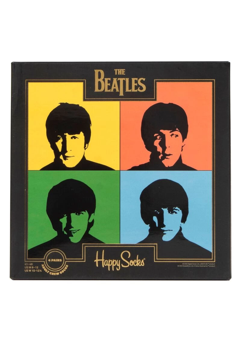 The styles housed in the box include an embroidered version of the Beatles’ classic early 60’s logo on a black sock with red accents, a white pair with colour images derived from the A Hard Day’s Night album cover photo sessions, outlined portraits of the band from the White Album era on yellow, and another embroidered pair on a navy and red ground, this time inspired by the Abbey Road cover.